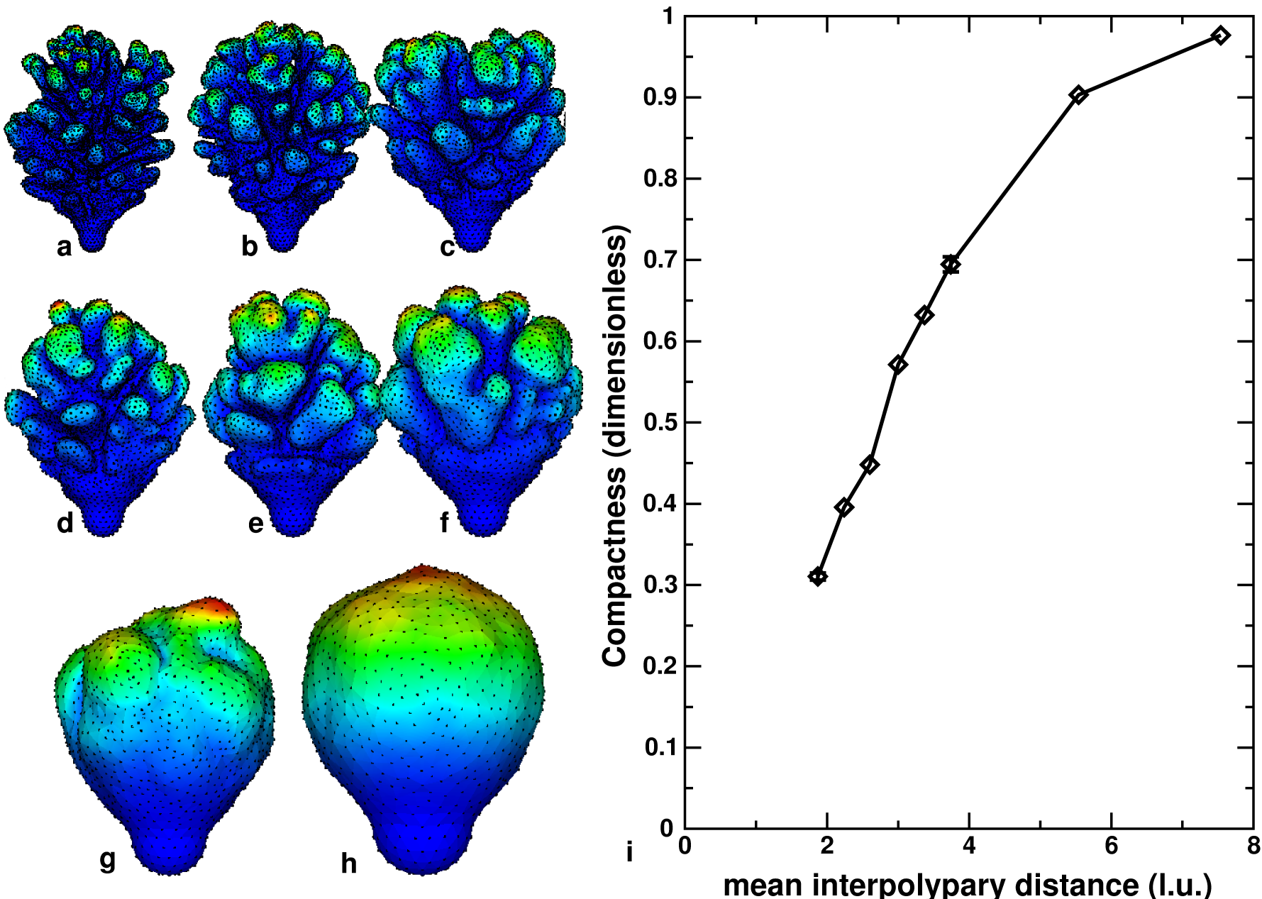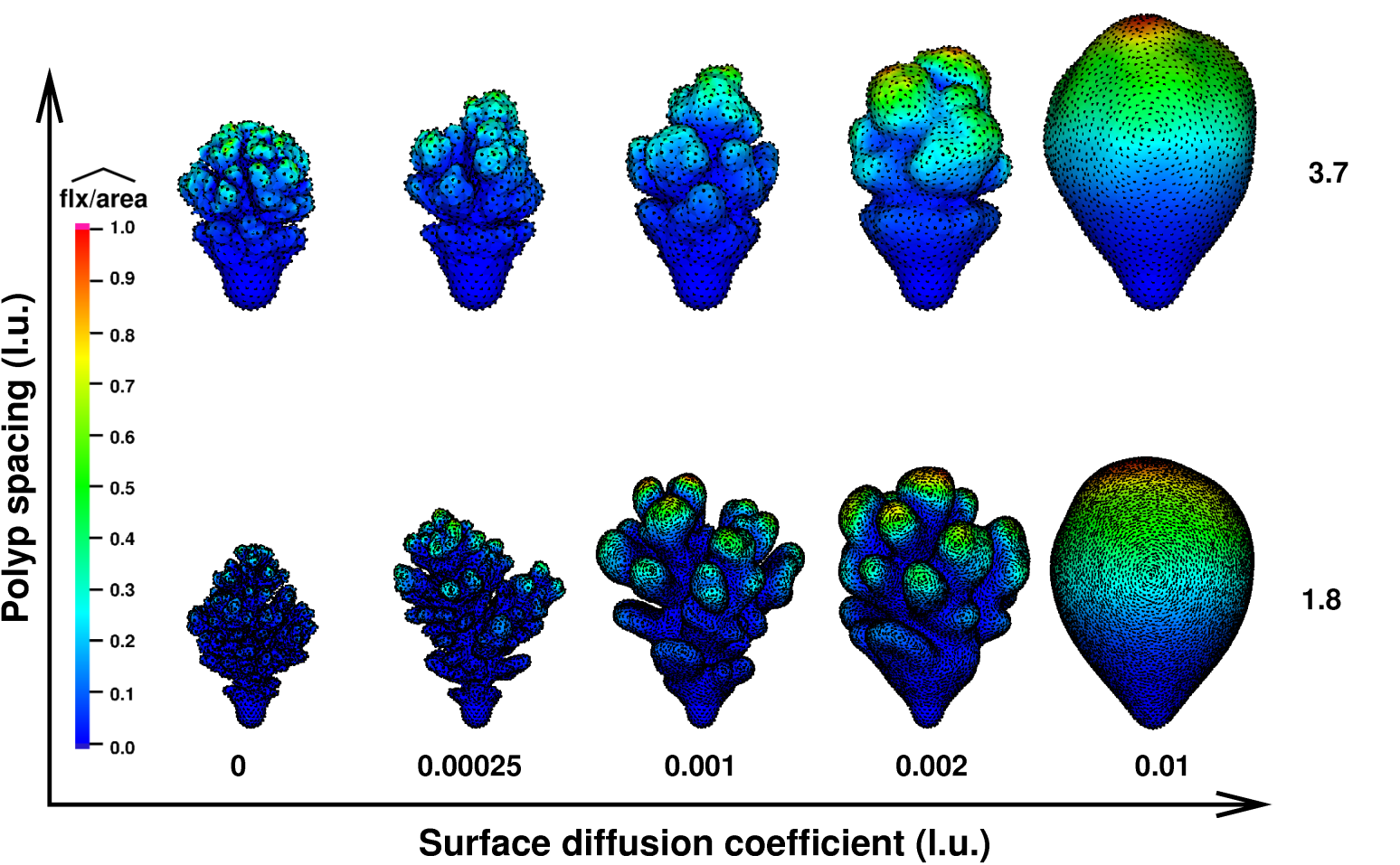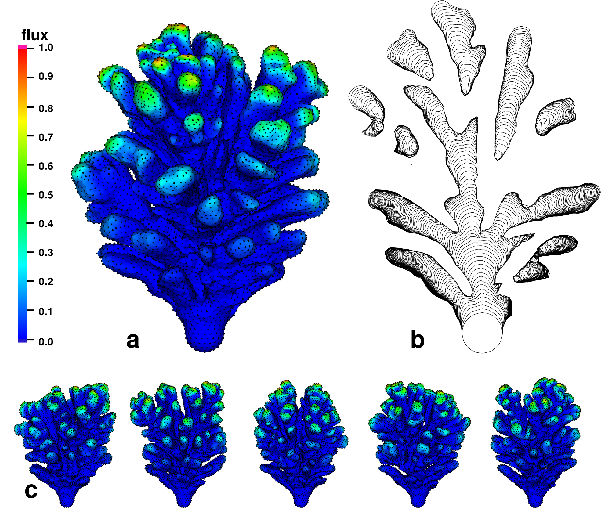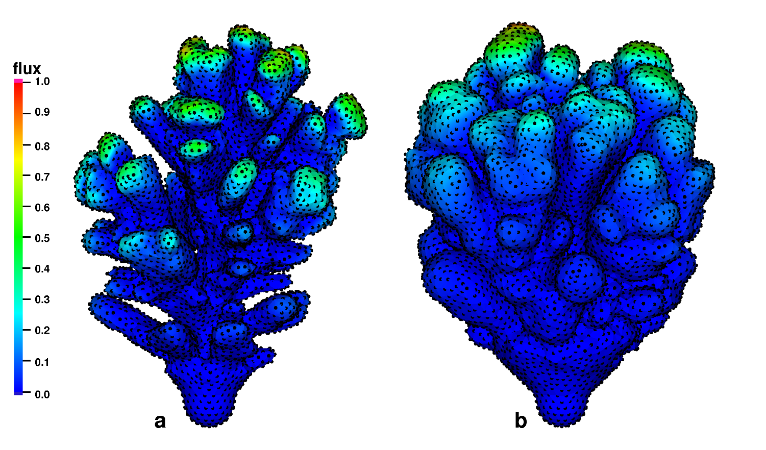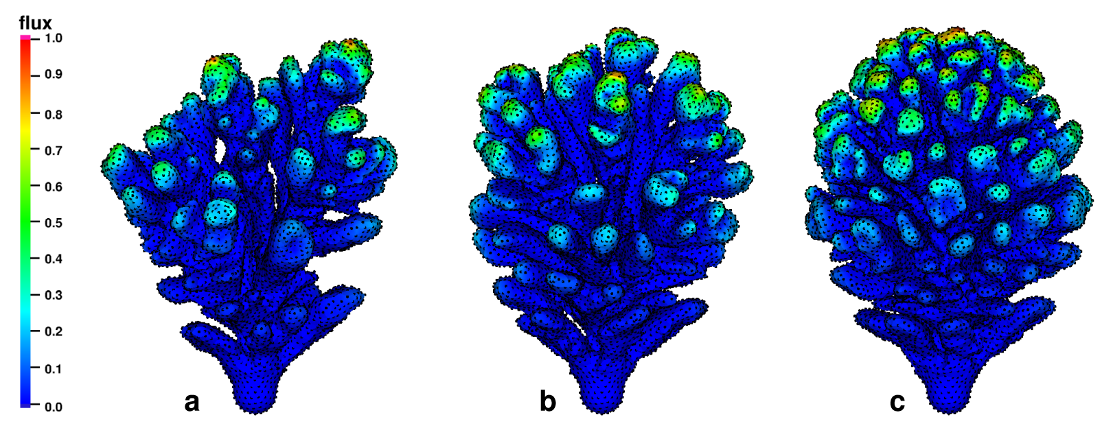 - Supplementary movies to Fig.5.4a and Fig. 5.4f: sections through the growth resource fields. Vertical sections parallel to x-axis. Horizontal sections half-way through the height of the simulated coral. Coral bar: growth resource concentration.