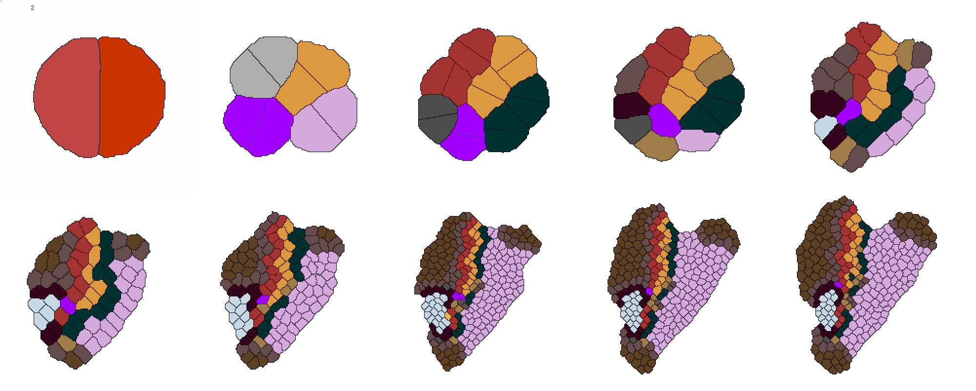 Development of a ``critter''. Colors identify cell types. Critter development movie. [AVI high quality (5MB)] [(AVI low quality (700KB)]